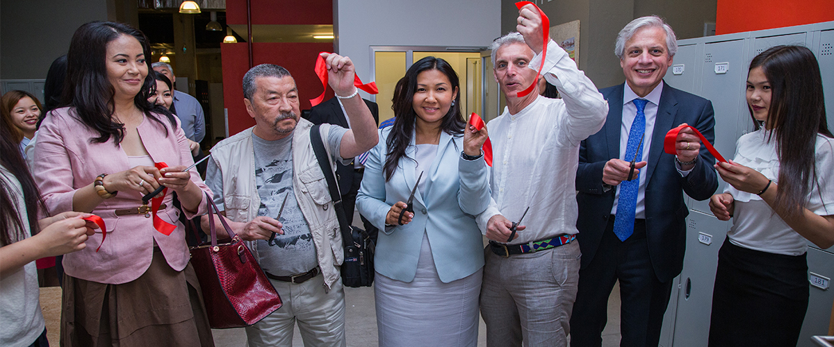 Andrew Wacthel, AUCA’s President, David Lakhdhir, the Chair of the AUCA board of trustees, Nazira Beishenalieva and Aijan Chynybaeva, both AUCA alumni and members of the board of trustees, Aktilek Tungatarov, the Director of the Department of Sustainable Development of the Kumtor Gold Company, and Gennady Bazarov, a film director and new faculty member for the Department of Television, Cinematography, and Visual Art, cut the ribbons to inaugurate the opening of the two laboratories.