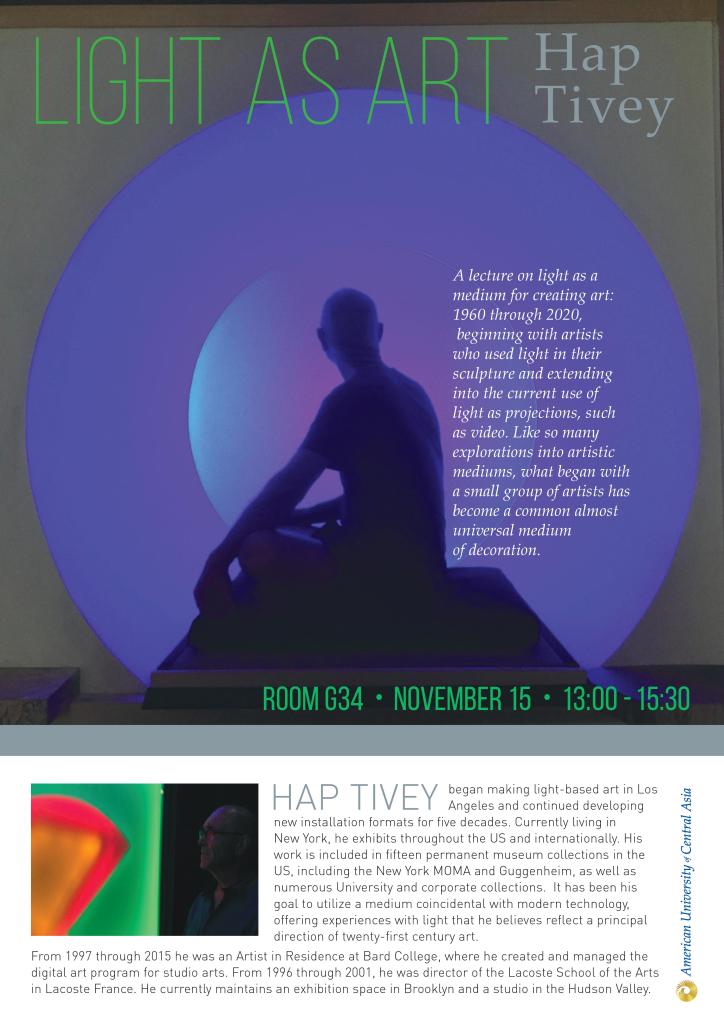 Television, Cinema and Visual Arts Department of the American University of Central Asia is pleased to invite you to the lecture “Light as Art” by Hap Tivey.