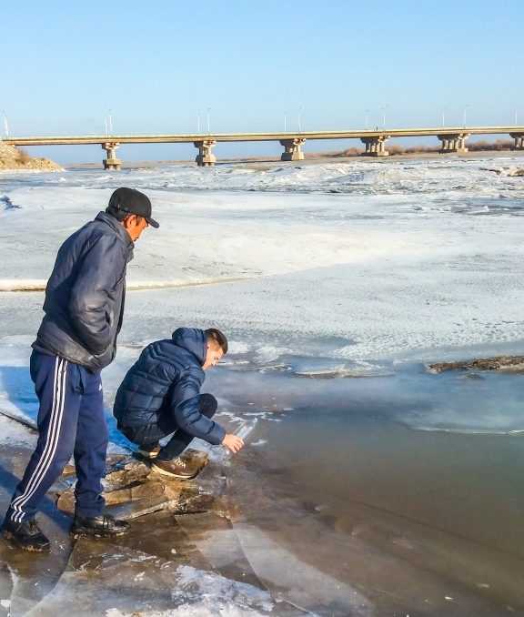 We first visited the lighthouse located on what once was a seashore. Standing there, one sees a desert in place of an endless sea and thinks, “I guess I’d be crazy if I had expected to see the fourth largest sea in the world in the middle of a desert.” There was a large graveyard of abandoned ships. It was ridiculous to see huge fishing vessels in the middle of desert. It reminded me of the movie Pirates of the Caribbean: At World’s End. There was a strong wind which reminded me of the sea, but it was coming from the desert. There were a couple of depression lakes where locals still practice fishing, but obviously incomparable with the former fish production. There, we collected water samples for laboratory analysis. Reaching water in the existing lakes and the Amu river was not an easy task. It was freezing cold and we had to break the ice—a job far more difficult than I had expected. The mixture of wind and cold left us no choice but to return to our hostel. The most interesting moment was when we were complaining to locals about the cold weather. I had an exchange semester in Norway during winter and it was not as cold as it was in Muynak. The locals tried to convince us that it was not cold, that sometimes it even gets twice as cold, something difficult for me to imagine.