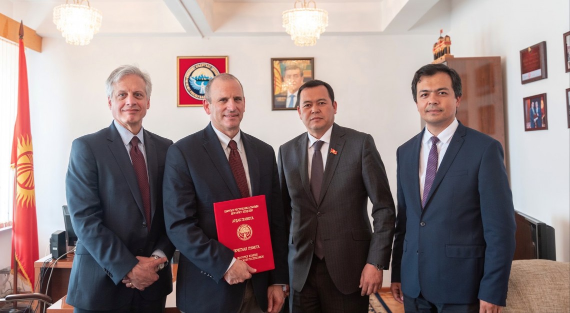 Today, on May 30, a member of the Board of Trustees and a former Acting President of AUCA Jonathan Becker was awarded a honorary diploma of the Jogorku Kenesh (National Parliament) for many years of productive work, significant contribution to the improvement of the international educational system, as well as efficient public service. The honorary diploma was presented by the Vice-Speaker of the Jogorku Kenesh Mirlan Bakirov on behalf of the parliament’s Speaker Dastan Dzhumabekov.