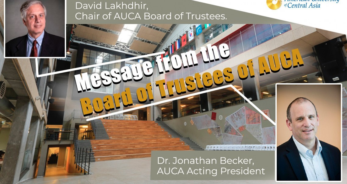 The Board of Trustees of the University has asked Dr. Jonathan Becker, the Executive Vice President and Vice President for Academic Affairs at Bard College, and a member of the Board of Trustees of AUCA, to assume the title of President on an interim basis, and he has graciously agreed to do so, effective immediately.  Dr. Becker has been on AUCA’s Board of Trustees for more than a decade, and served as interim President for most of the 2018-2019 academic year.  Dr. Becker will in the coming days be arranging meetings with key constituencies within the University, including the Academic and Student Senates.