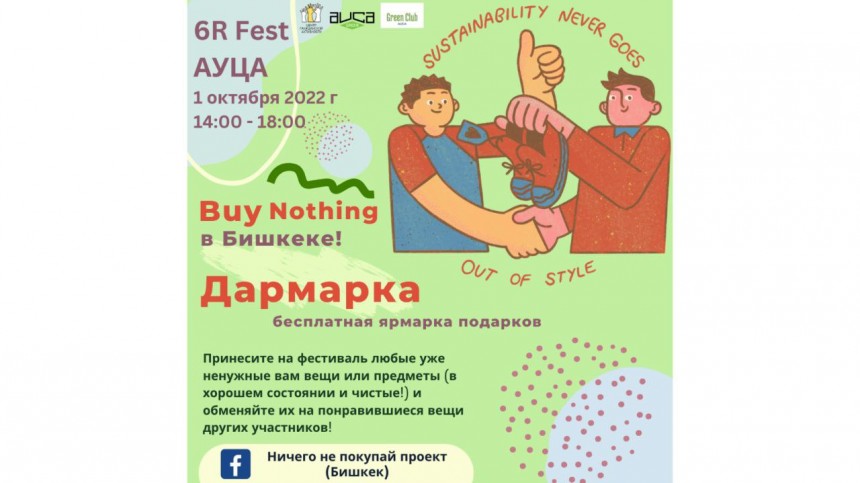 On the 1st of October from 2:00 pm to 6 pm, the 6R Fest: Reduce, Reuse, Recycle, Refuse, Rot, Rethink whereby an exchange of items within “Buy Nothing” initiative will take place at the American University of Central Asia (AUCA). The 6R Fest is organized by the Center of Civic Engagement AUCA.