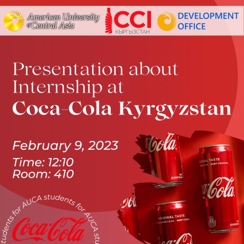 We are happy to inform you that Coca-Cola İçecek Kyrgyzstan (CCI Kyrgyzstan) will hold a presentation of its Next Talent internship program. Students will have a great opportunity to learn about internship opportunities at CCI Kyrgyzstan in various fields with further opportunity for employment and to get answers to relevant questions directly from Coca-Cola HR director.