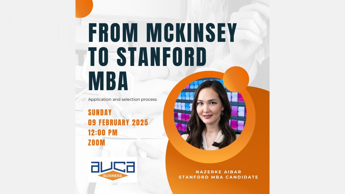 AUCA Business Department is happy to invite you to an exclusive webinar featuring Nazerke Aibar, an accomplished professional and inspiring individual currently pursuing her MBA at Stanford University—one of the most prestigious institutions in the world.
