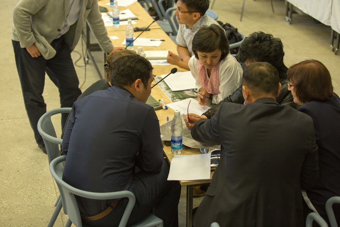 Разделившись на 8 групп в соответствии с районами Чуйской области, участники семинара начали работу с картами – отмечали населенные пункты, подверженные разрушительным стихийным бедствиям, и определяли степень их незащищенности (помечая их разными цветами), указывали величину, сезонность и опасность угроз, их последствия для людей, активов, экосистем, а также способность указанных районов уменьшать последствия угроз.