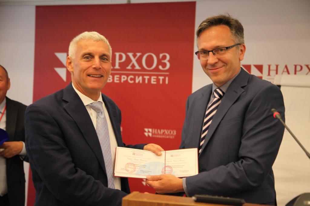 23 сентября Кшиштоф Рыбиньски, ректор Университета Нархоз (Казахстан), вручил Эндрю Вахтелю, президенту АУЦА, диплом «Почетного профессора Университета Нархоз» города Алматы. На церемонии вручения доктор политических наук и профессор Университета Нархоз, Адиль Джунусов надел на Эндрю Вахтеля казахский национальный чапан и головной убор.