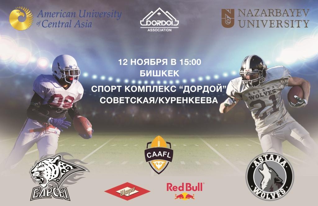 12 ноября 2016 года в Бишкеке состоится межуниверситетский матч по американскому футболу между командами Кыргызстана и Казахстана - «Барсы» (Американский Университет в Центральной Азии (АУЦА) и «Волки» (Назарбаев Университет (НУ).