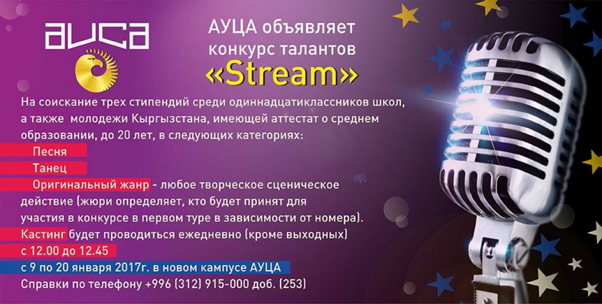 9 января 2017 года, в Американском Университете в Центральной Азии (АУЦА) стартует ежегодный вокально-артистический конкурс «Stream» среди учеников одиннадцатого класса средних образовательных школ Кыргызстана, а также молодёжи до 20 лет имеющей аттестат о среднем образовании, граждан Кыргызстана, на получение стипендий для обучения в АУЦА.