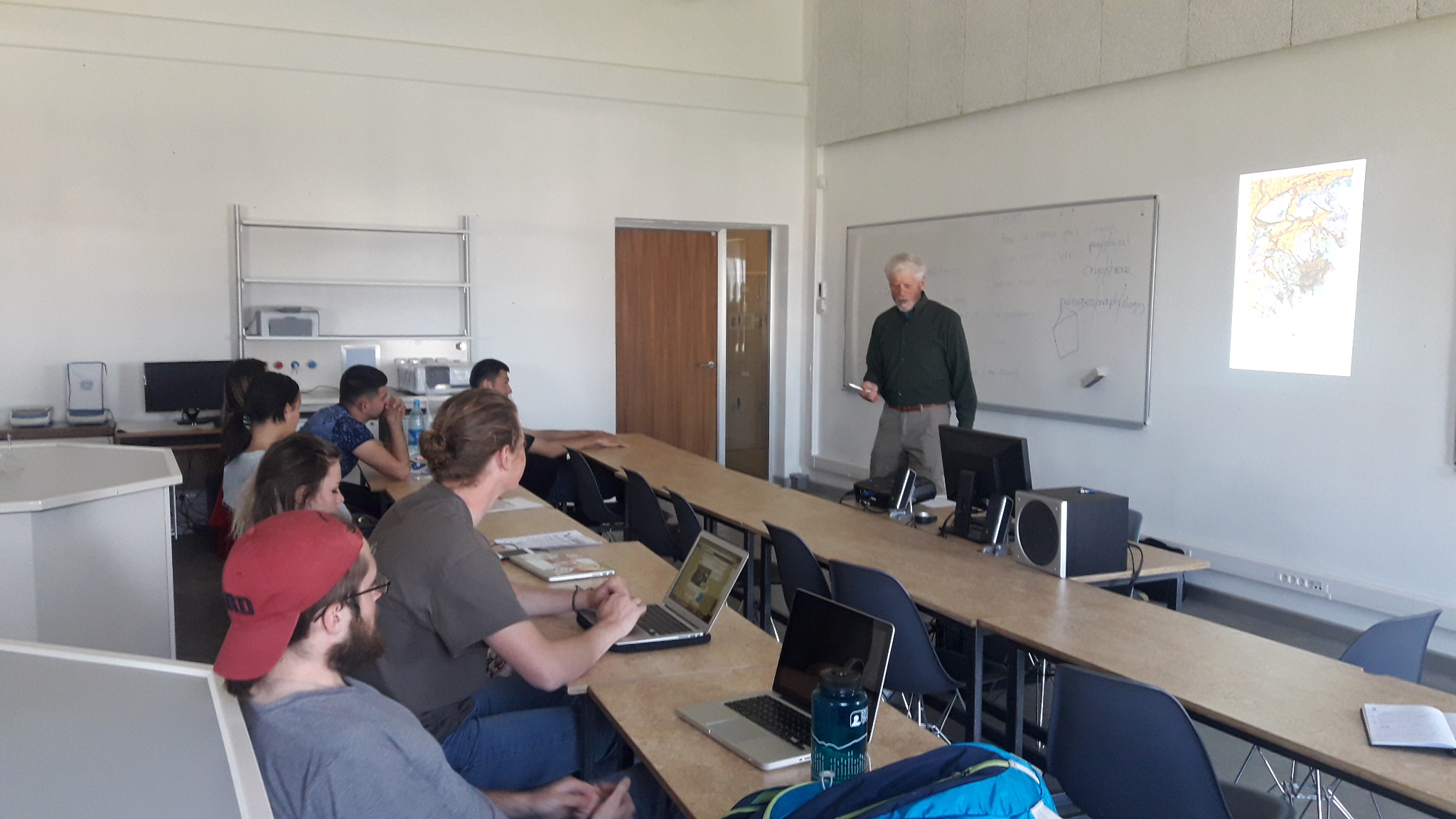 У Тоби Уиллера своя методика преподнесения информации, он больше акцентирует на практические знания. Аргумент этому то, что он исписал всю доску с объяснением определенных территорий. Хотя, это была всего одна лекция, но все же он сумел донести до нас многие вещи, связанные с ледниками, лесами и об Исык- Кульской местности. Много полезного и интересного материала было предоставлено после лекции на темы: «Поверхностная геология», «Оценка устойчивости хвостохранилища Кумтор и тд.