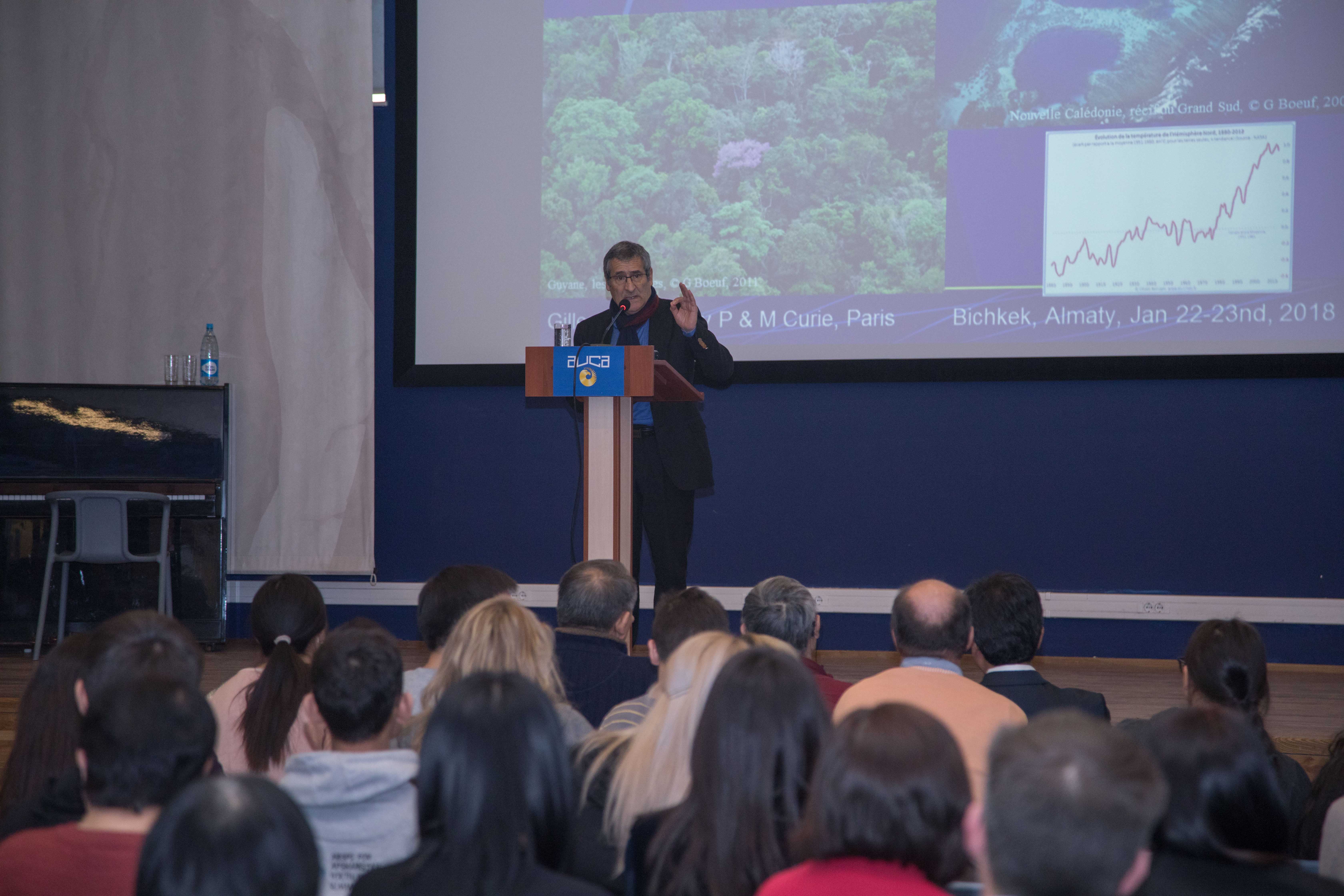 Вчера в АУЦА выступил с открытой лекцией один из ведущих мировых специалистов в области биоразнообразия, океанолог и эколог Жиль Бёф. Он – профессор Университета Пьера и Мари Кюри в Париже, президент Научного совета Французского агентства по биоразнообразию, бывший президент Музея естественной истории Парижа.