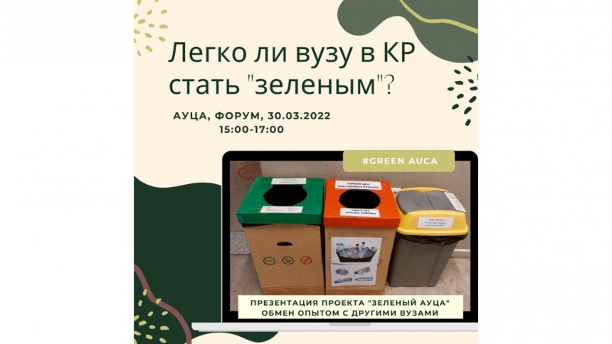 В феврале–марте в Американском университете в Центральной Азии стартовал и начал развиваться проект «Зеленый АУЦА». Это проект по раздельному сбору и сдаче на переработку/утилизацию 4-х видов отходов (бумаги, пластика, электронных отходов, батареек).