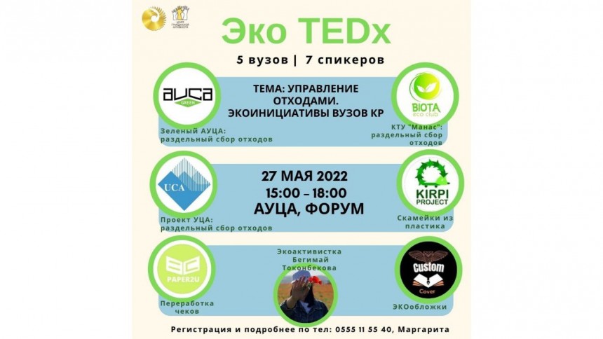 Центр гражданской активности АУЦА приглашает всех желающих на мероприятие, посвященное экологическим инициативам в области управления отходами, которые инициированы и реализуются на данный момент вузами Кыргызстана.