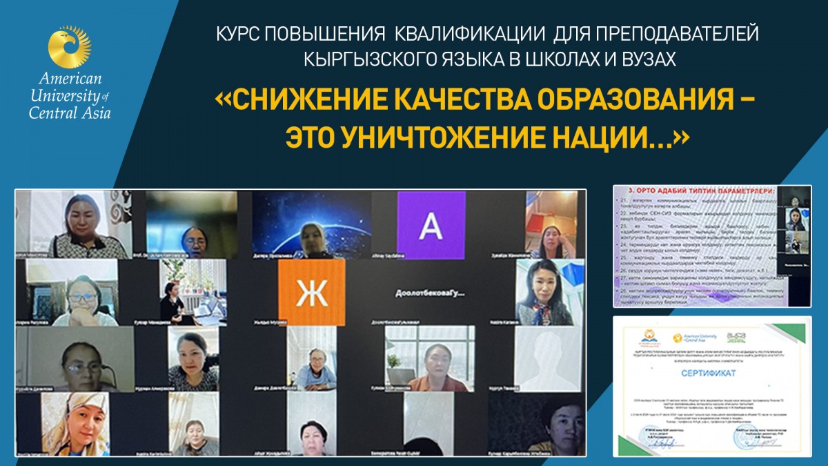 В июле этого года (2 – 31.07.24.) при поддержке Республиканского института повышения квалификации и переподготовки педагогических кадров при Министерстве образования и науки Кыргызской Республики и Центра обучения, преподавания и технологий Американского университета в Центральной Азии около ста учителей школ и преподавателей вузов прошли курс повышения квалификации по программе «Кыргызский язык в академическом чтении и письме». Мы попросили рассказать об этом курсе руководителя Центра обучения, преподавания и технологий АУЦА, PhD Ангелину Момчилову Попову и тренера курсов – профессора АУЦА, доктора филологических наук Уулкан Джолдошбековну Камбаралиеву.