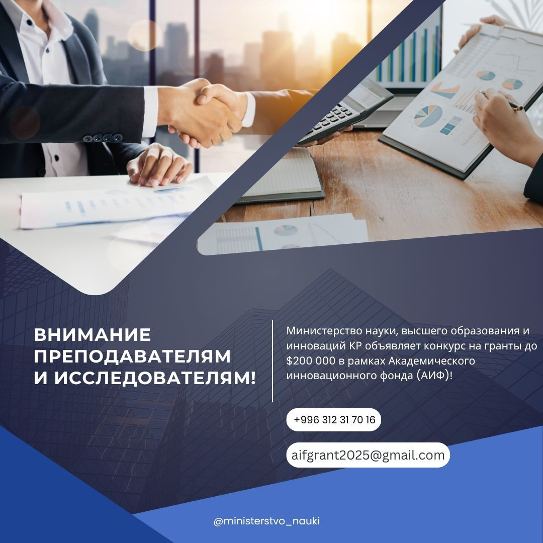 Министерство науки, высшего образования и инноваций Кыргызской республики в рамках проекта «Качество и инновации в высшем образовании» (КИВО) объявляется первый раунд конкурса на предоставление грантов Академического инновационного фонда (АИФ) для финансирования инновационных академических и исследовательских проектов, направленных на повышение исследовательского потенциала вузов по любым дисциплинам и укрепление сотрудничества между университетами, и с секторами экономики.