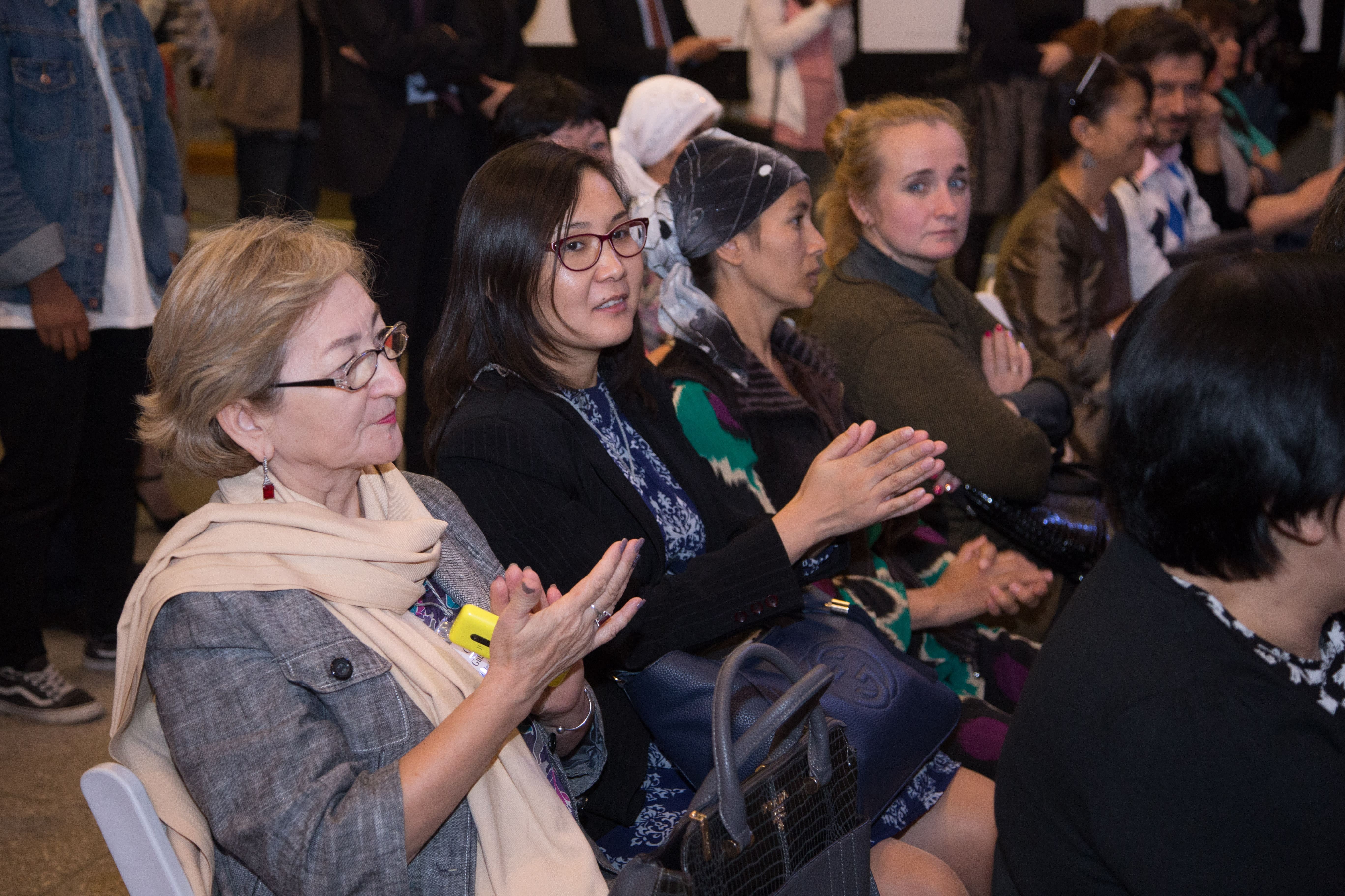 Открывали выставку президент АУЦА Эндрю Вахтель, руководитель офиса МОМ в Алматы и заместитель регионального координатора по Центральной Азии Татьяна Хаджиэммануэль, заместитель председателя Госслужбы по миграции при ПКР Алмазбек Асанбаев, представители посольств разных стран и др.